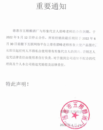关于德惠市五粮酿酒厂与形象代言人邵峰老师停止合作的声明